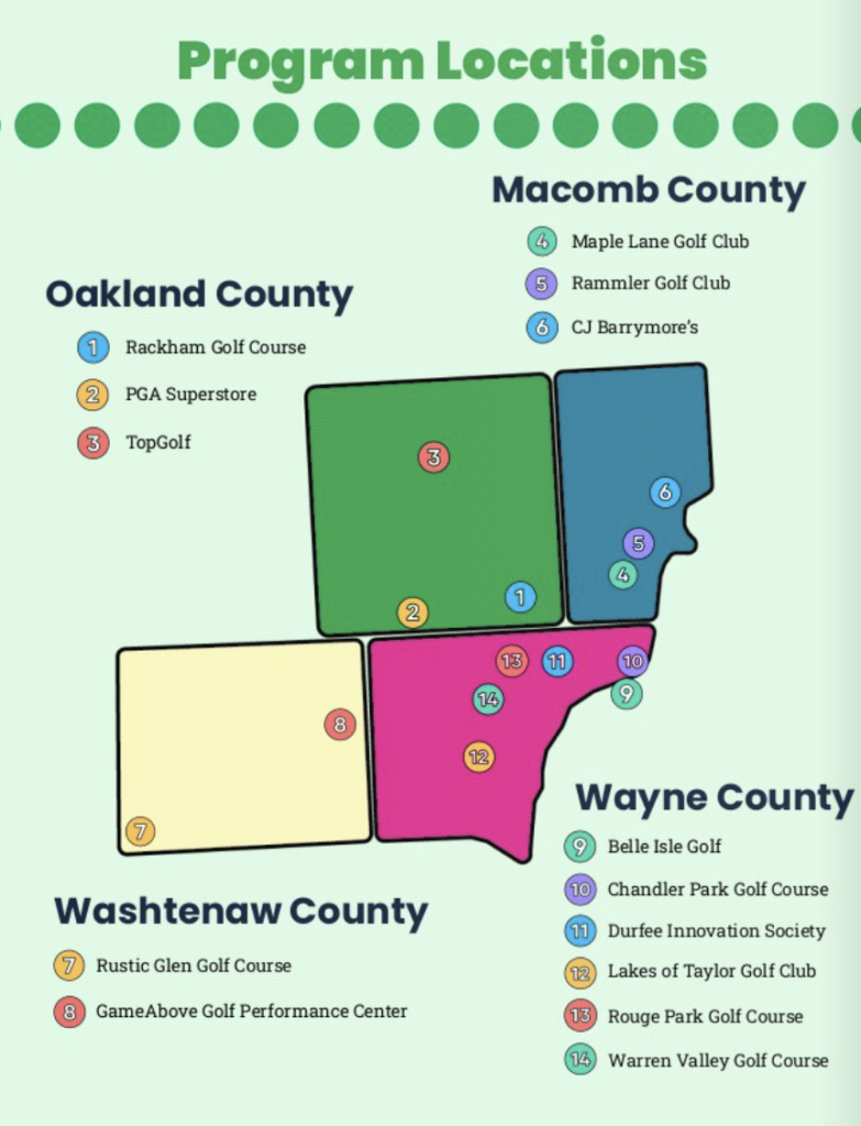 Rackham (Mon), Rammler (Mon), Rouge Park (Tues), Chandler Park (Wed), Indian Springs (Wed), Beech Woods (Thurs)